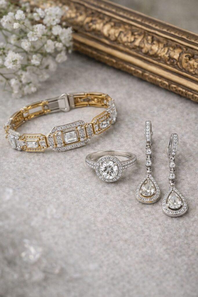 - Think geometric bracelets, modern halo rings, and vintage-inspired drop earrings with contemporary settings.