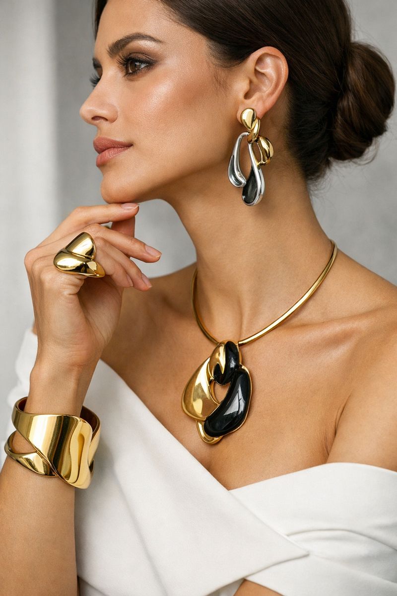 ✔ Start with a statement piece: One sculptural earring or bold chain can define your entire look.