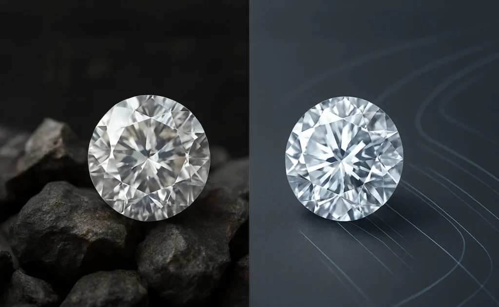 Natural diamonds require billions of years and geological rarity. Lab grown diamonds, on the other hand, are produced within weeks using human-controlled environments. This difference directly impacts pricing, availability, and long-term value perception.